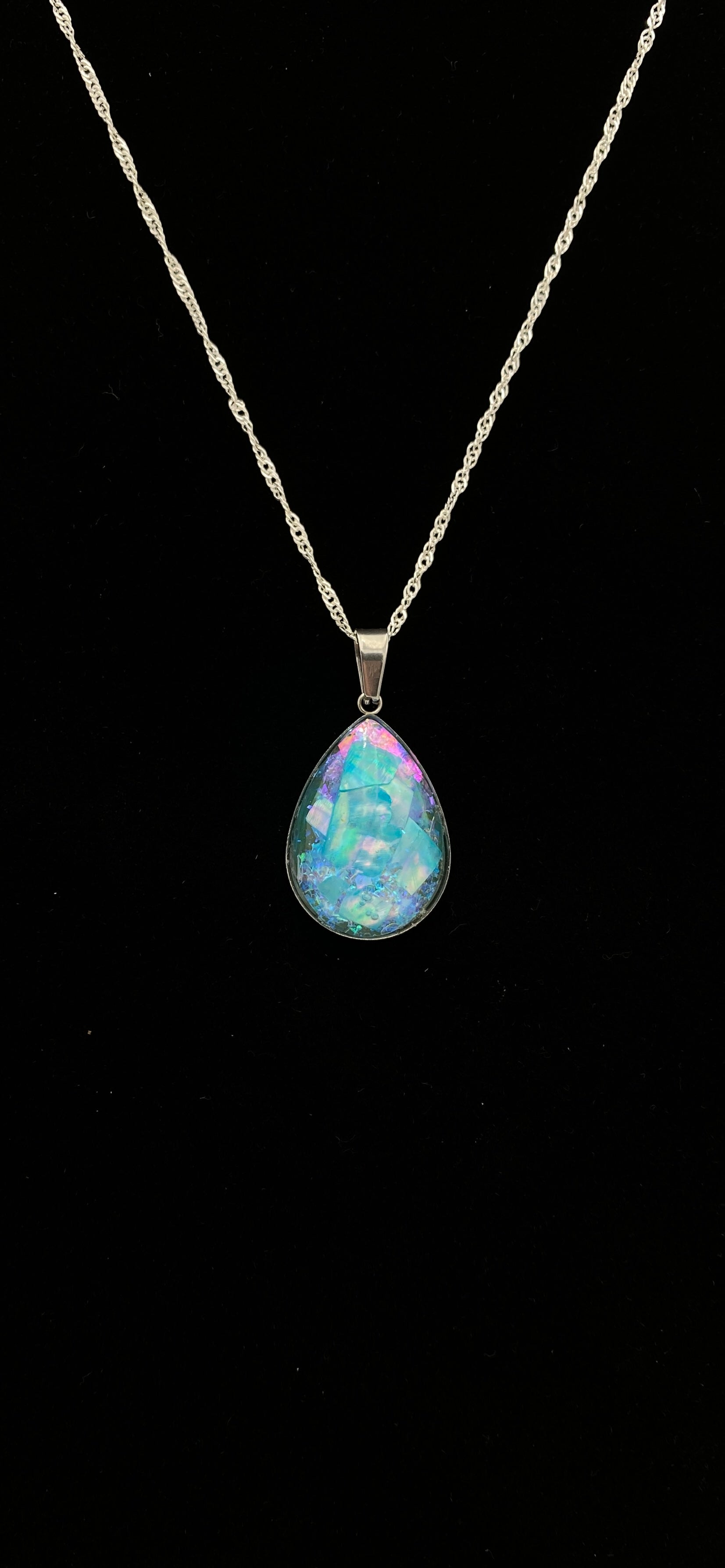 Handmade with care, the Ocean's Tear Necklace features a striking tear-shaped pendant in a captivating blue hue. Crafted expertly, this unique piece adds a touch of elegance to any outfit. Stand out from the crowd with this one-of-a-kind necklace.Handmade teardrop pendant with chain